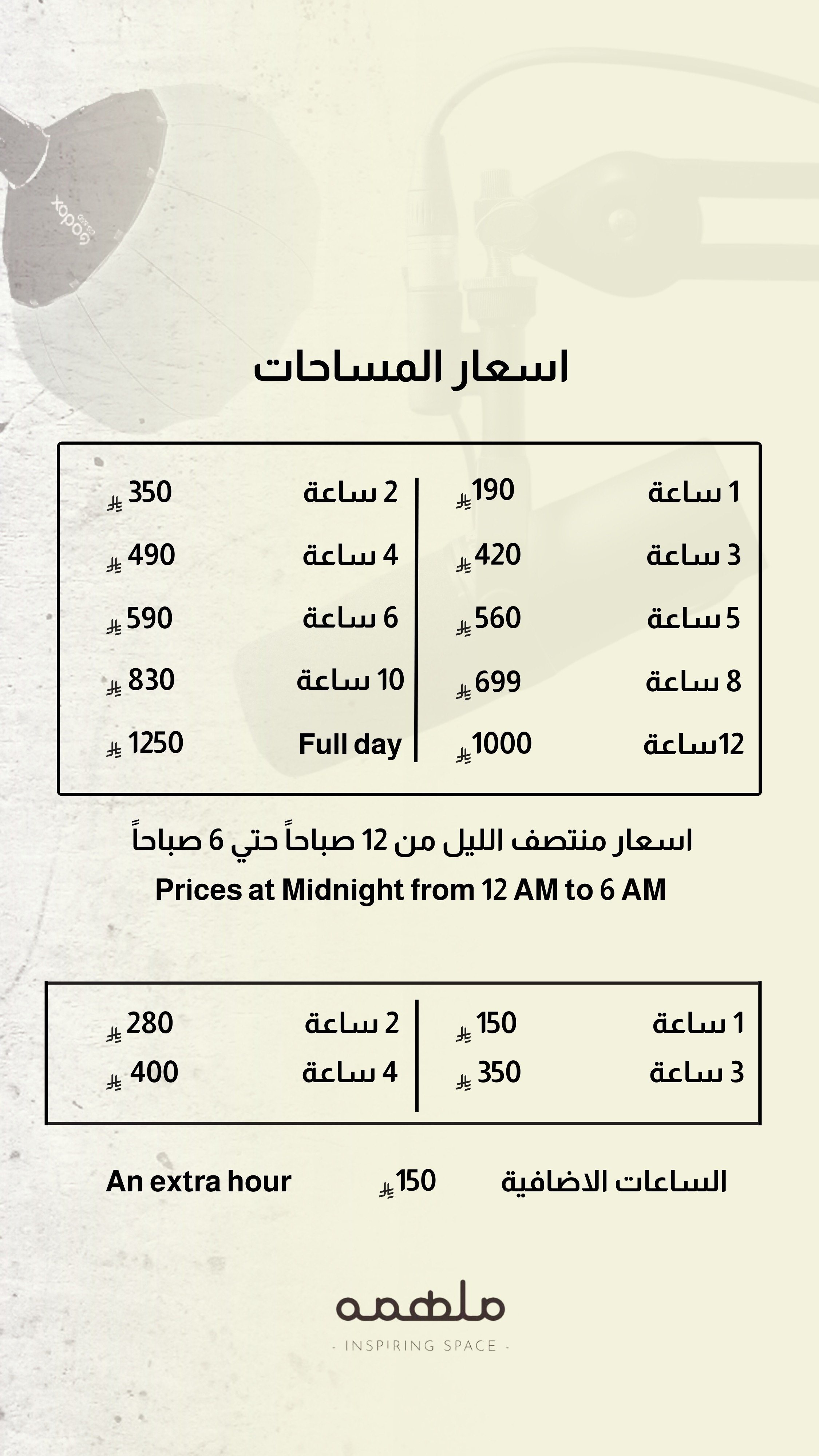 ٢٤/٧متوفره - عماله مدربه متوفره عند الطلب مجاناً مع حجز المساحه - التجديد المستمر في أدوات التصوير - أسعارنا متناوله بخدمات متميزه - الأدوات والإضاءات متوفره مجاناً مع أي حجز